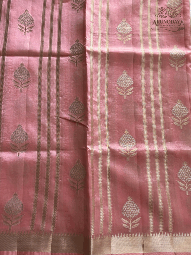 Elegant Organza Stripe Saree with handcrafted Kadwa Butta, showcasing Banarasi artistry. Lightweight, sheer, and crisp in texture—perfect for festive and elegant daytime occasions. Includes contrast unstitched blouse piece.