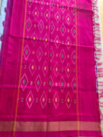 A designer handloom twill ikkat silk saree is a traditional Indian saree made from pure silk and handwoven on a loom. The saree features intricate design patterns that are achieved through a resist-dyeing technique known as ikkat.This technique involves tying and dyeing the threads before they are woven into the fabric, resulting in a beautiful and unique pattern. The twill weave gives the saree a luxurious texture and drape, making it perfect for special occasions.Overall, a designer handloom twill ikkat silk saree is a timeless and elegant piece of clothing that celebrates India’s rich textile