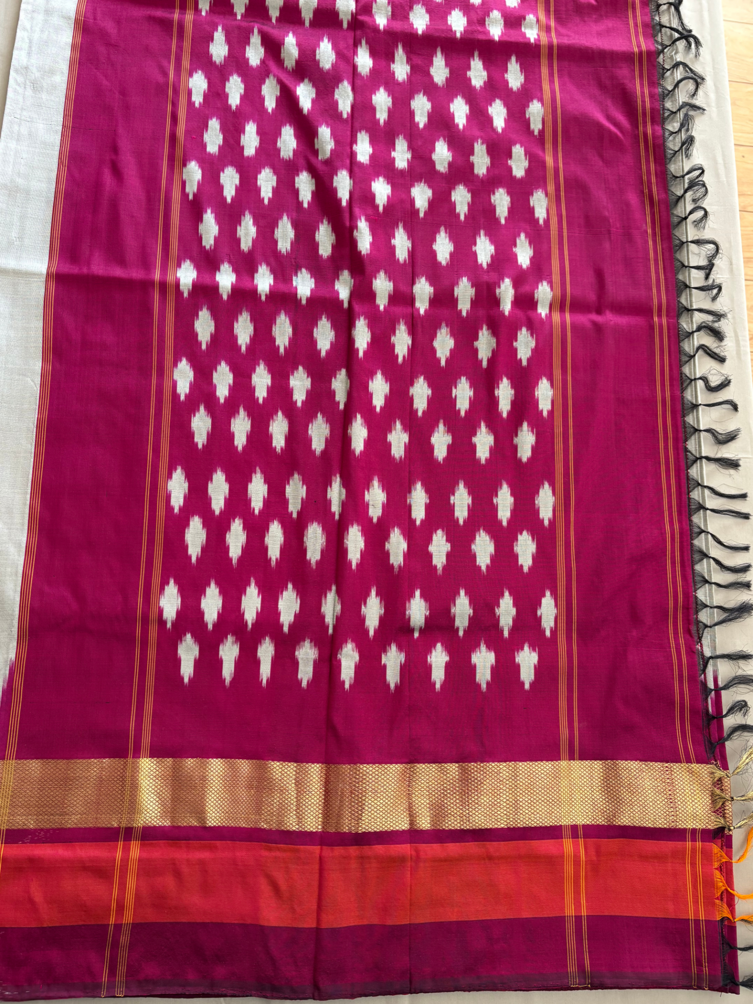 Indulge in the luxurious elegance of our Ikkat silk saree, a masterpiece that seamlessly blends traditional artistry with modern sophistication. This saree features a pristine plain body that exudes simplicity and grace, serving as the perfect canvas for the exquisite detailing that follows.