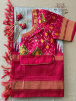 – Accompanying the saree is a blouse featuring a striking patola design. Known for its geometric patterns and vibrant colors, the patola design adds an element of cultural richness and artistic flair.