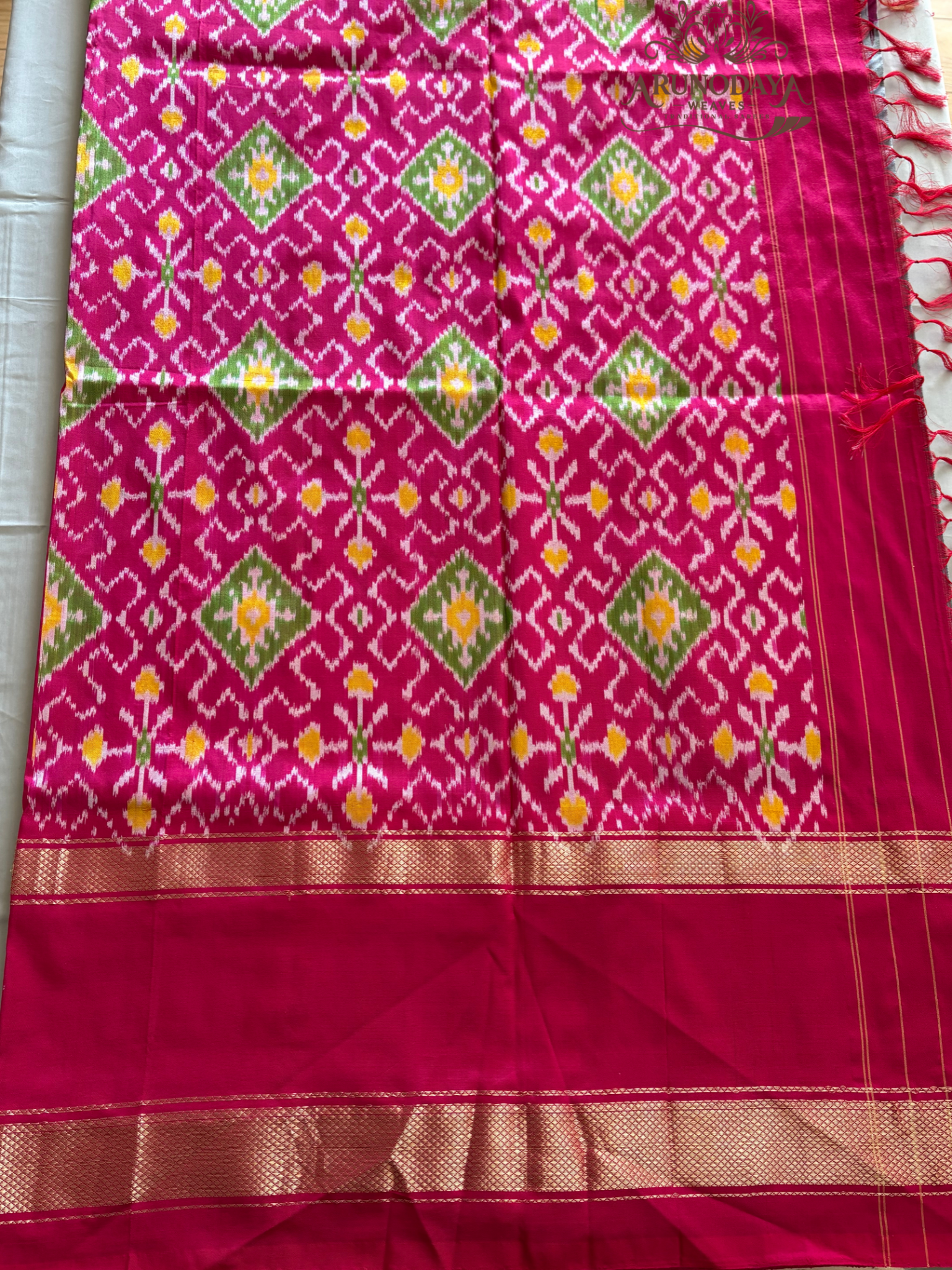 Elevate your wardrobe with our exquisite Ikkat silk saree. Featuring a plain body adorned with a luxurious tissue ZARI Double border and a pallu, complemented by a Patola design blouse, this saree combines traditional elegance with contemporary style.